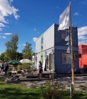 lejlighed i i boligbebyggelsen, nyttehave mellem blokkene og Sigrids UdeStue, som er flytbare pavilonner, containere mm.